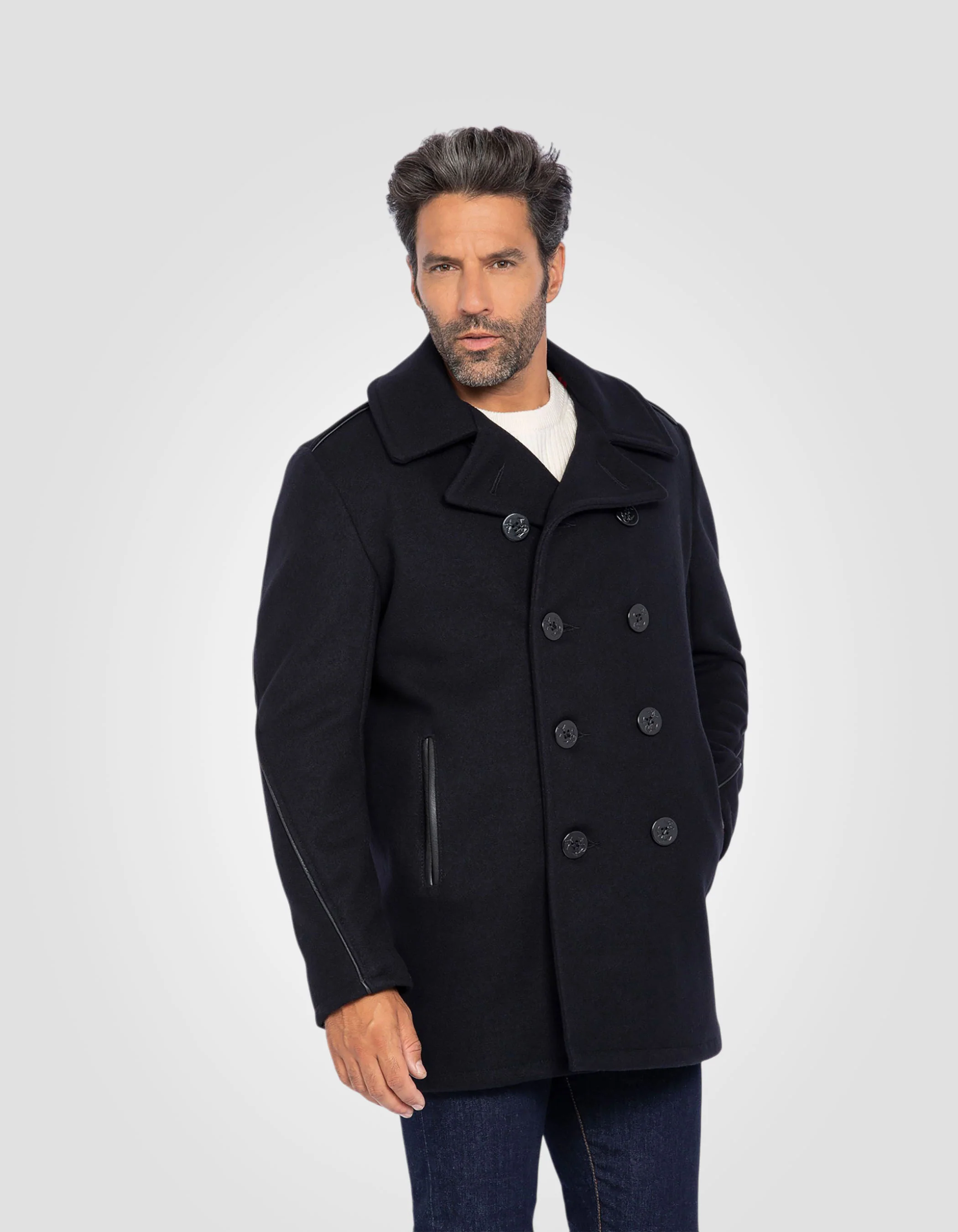 Directement importé des États-Unis et confectionné à partir de laine mélangée, le 740C est le caban revisité et ajusté de la U.S. Navy. Sa doublure rouge satinée et ses finitions en cuir lui apportent du caractère.