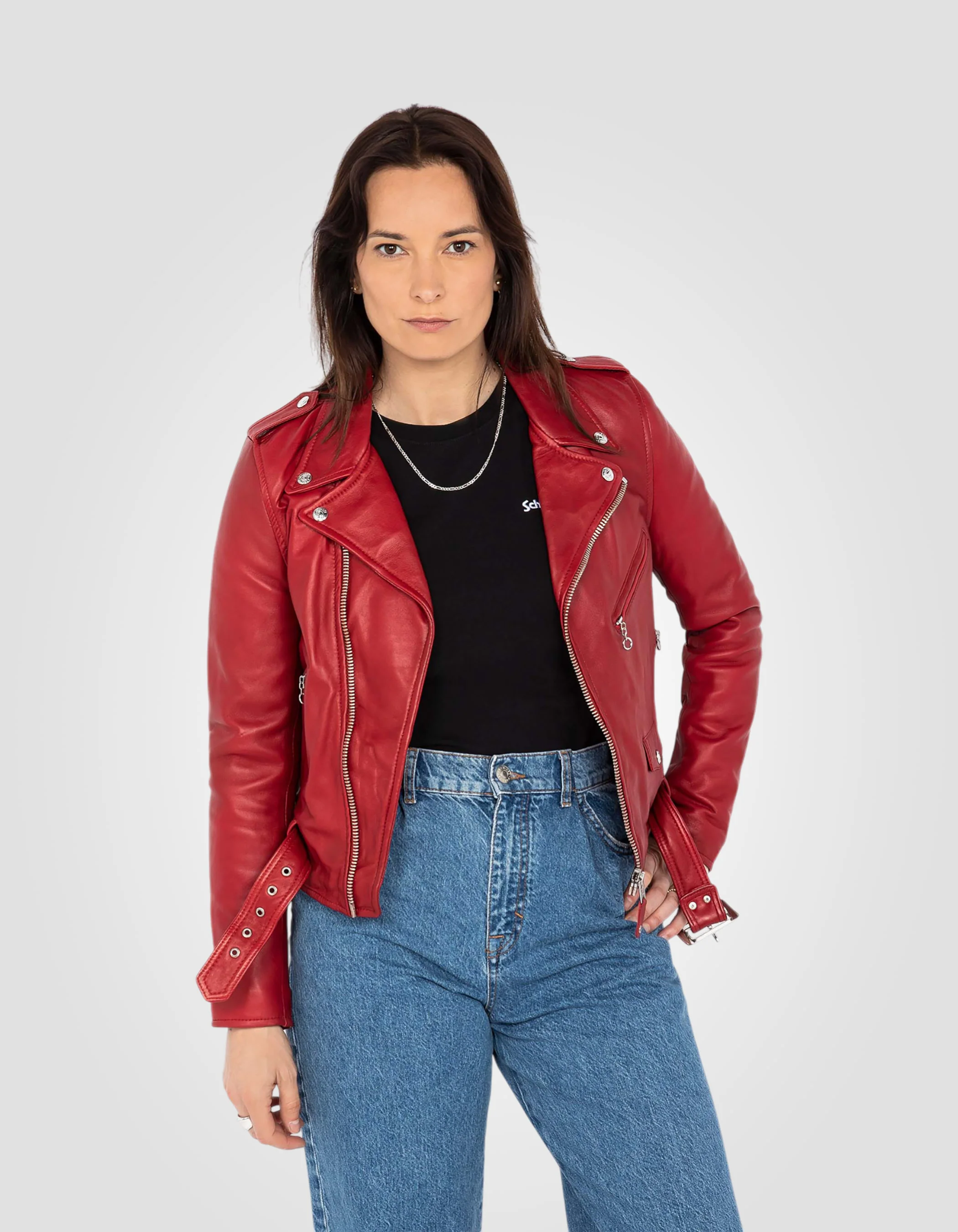 Blouson Perfecto® rouge avec ceinture, cuir d'agneau