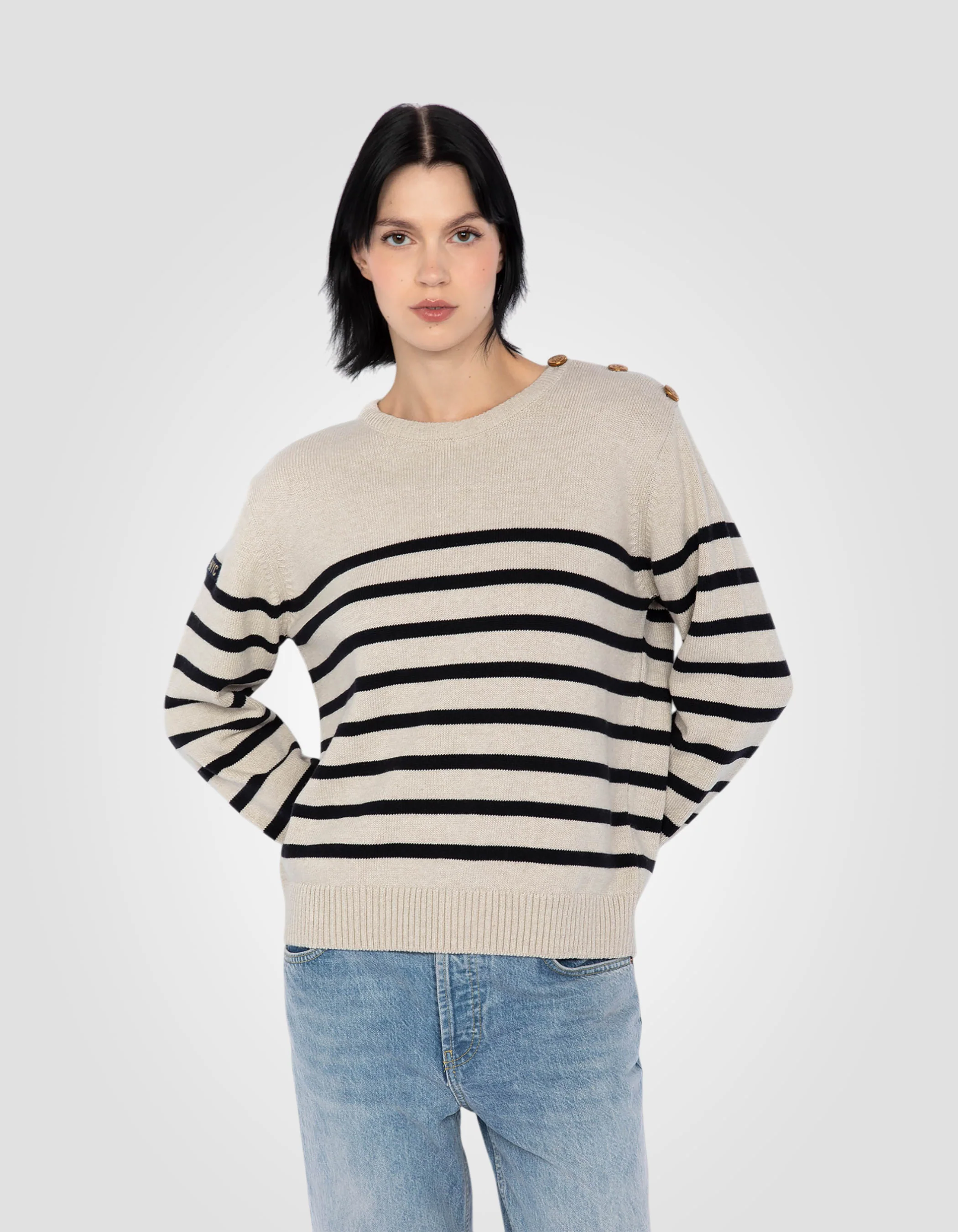 Pull marin naturel et bleu marine avec boutonnage épaule